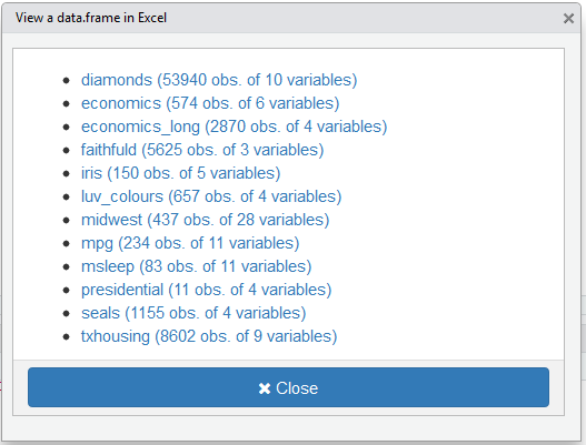 pivot_longer() : transformer des colonnes en lignespivot_wider() : transformer des lignes en colonnesseparate() : séparer une colonne en plusieurs colonnesseparate_rows() : séparer une colonne en plusieurs lignesunite() : regrouper plusieurs colonnes en une seuleextract() : créer de nouvelles colonnes à partir d’une colonne de textecomplete() : compléter des combinaisons de variables manquantesUtilisez l’addin viewxl pour exporter interactivement des data frame de l’environnement global vers Excel